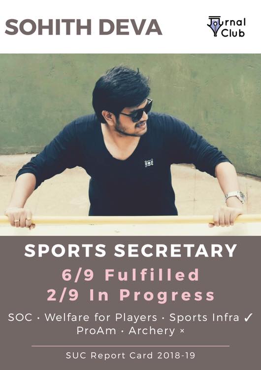 The Boys’ Sports Secretary, Sohith Deva’s manifesto aimed at the overall enhancement of the Sports culture on campus along with improvements to Arena. The manifesto spoke of 9 points out of which, 6 are fulfilled, 2 are in progress and 1 has not been fulfilled yet. Click here to view the manifesto on the Election Commission Facebook Page.