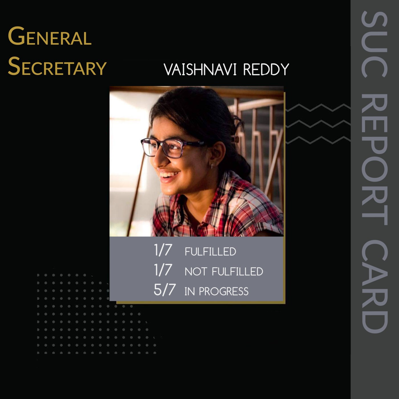 Vaishnavi Reddy, the General Secretary of the Student Union Council has highlighted 8 issues in her election manifesto, with Mental Health, Campus Culture and FGP standing out amongst a host of other general issues. With point 8 talking about Harassment, she assures that the GB can reach out to the SUC at any point. Point 9 of the manifesto promises a dynamic manifesto which encompases the general isssues tackled which are outside her manifesto. Out of the other 7 issues (9 point manifesto) and her plans to address them, 1 has not been fulfilled, 5 have been partially completed or are in progress, and 1 has been fully fulfilled.