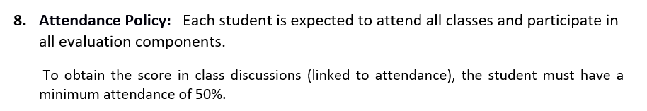 “…While regular attendance of students is strongly encouraged, instructors and instructors-in-charge should refrain from assigning direct marks for attendance. However, attendance may be considered as a distinguishing factor when determining grades for students with identical scores who are on the borderline between two grades.”
